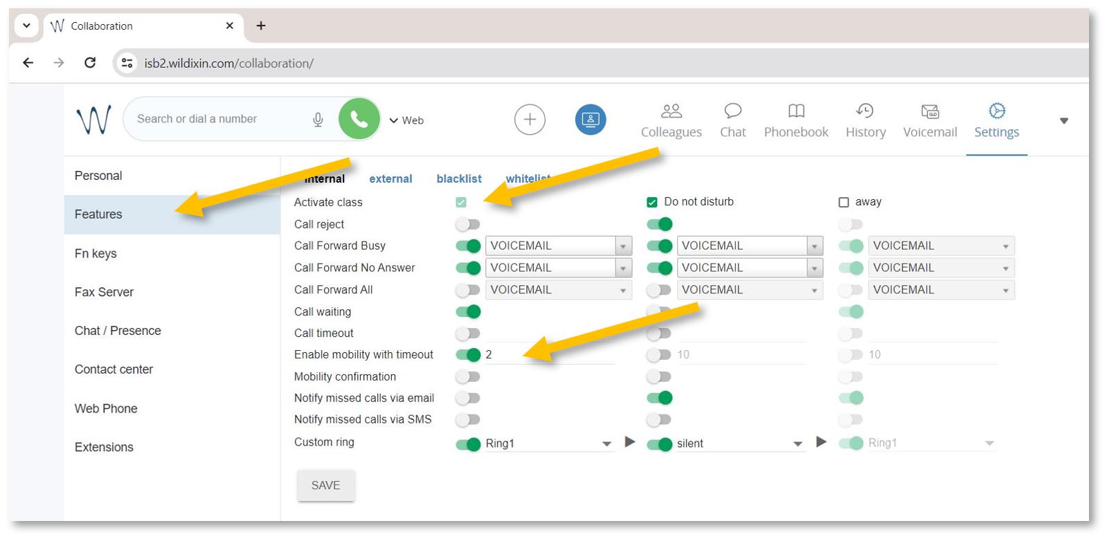 Then select the Features tab, activate the Internal Class, and Enable mobility with timeout. In the example underneath, the default (10) was changed to 2, meaning that after 2 seconds, the mobile phone and the computer (if logged in to Wildix) will also ring.